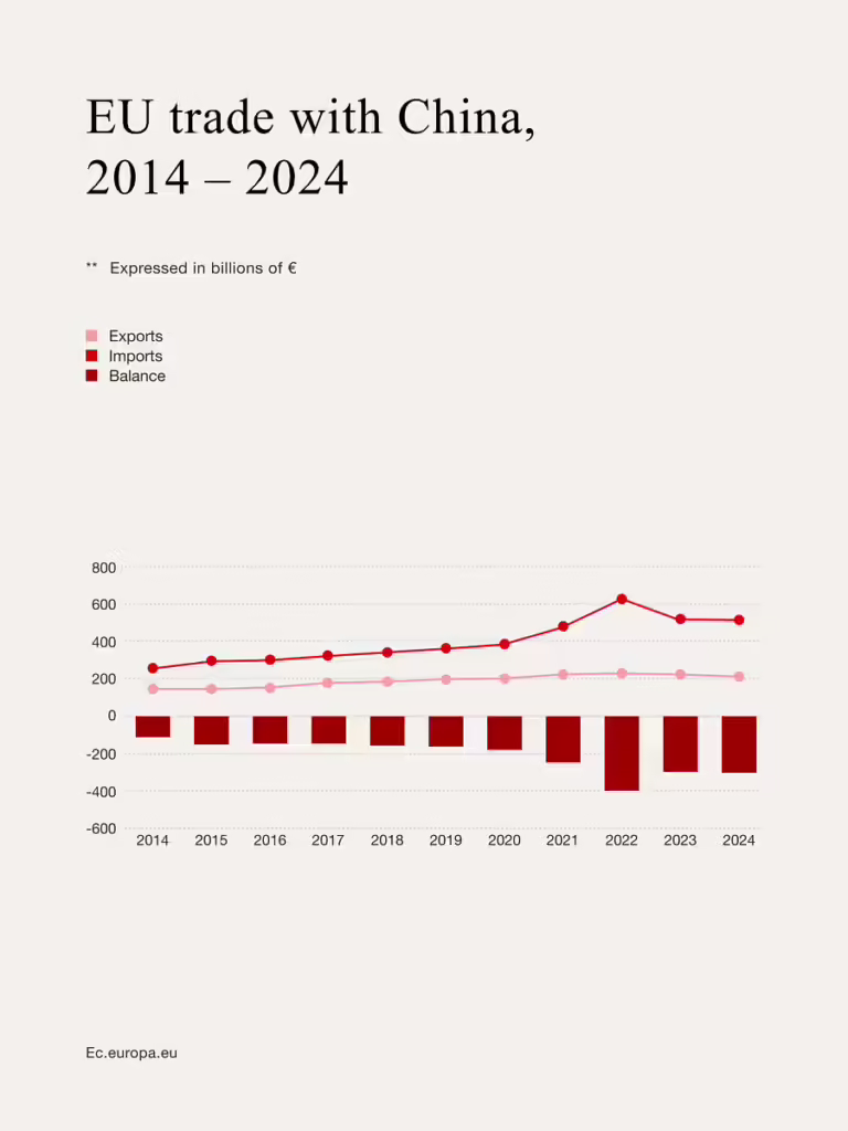 China’s “dual circulation” strategy—focussed on boosting domestic demand while diversifying international partnerships—has made Europe an increasingly vital economic partner. In 2023, China was the EU’s largest source of imports (€626 billion) and its third-largest export destination (€230 billion).
