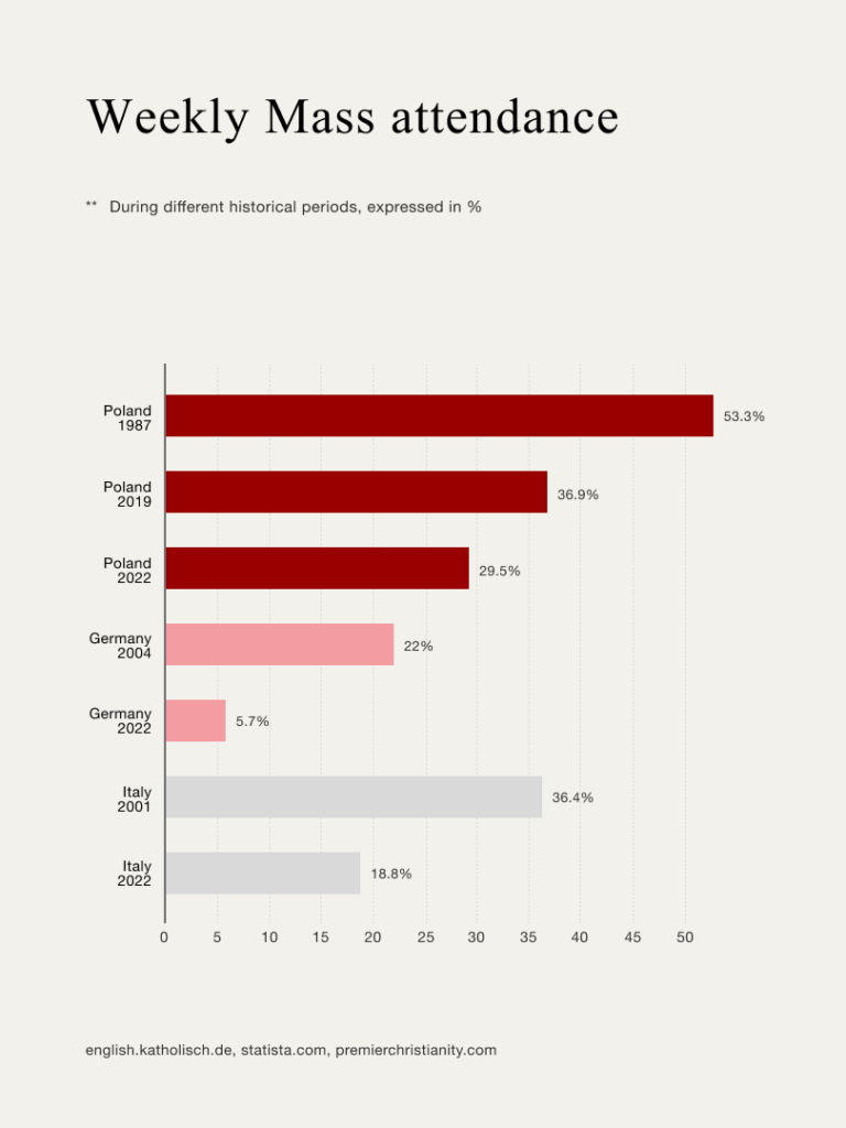 The numbers do not lie: Catholicism is in decline across Europe. In Germany, as of 2023, approximately 24% of the population identifies as Catholic, totaling around 20.4 million individuals. However, regular Mass attendance has seen a significant decline, with only about 6.2% of Catholics attending services weekly. Italy has also experienced a notable decrease in religious observance. Over the past two decades, weekly Mass attendance has dropped from 36.4% to 18.8% of the population. This decline has been particularly pronounced among younger Italians; as of 2024, only 10.9% of Italians aged 18 to 34 attend services regularly. Even Poland, once a Catholic stronghold, is seeing a decline: Mass attendance fell from 36.9% in 2019 to 28% in 2021, though a minor rebound to 29.5% in 2022 suggests some resilience. Yet, across the continent, secularisation is making significant inroads .