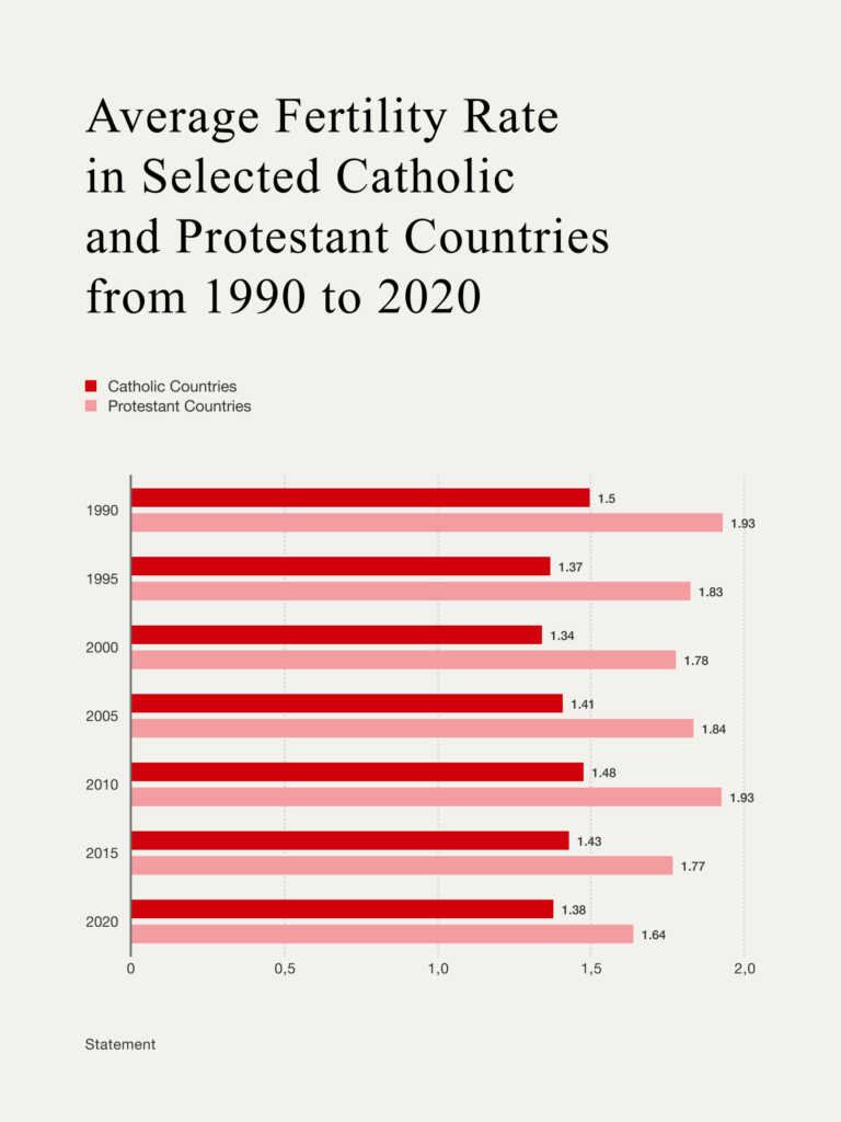 Historically, Catholic countries in Europe that have undergone significant secularisation—such as Italy, Spain, Portugal, Malta, Poland, and Austria—now consistently face low fertility rates. In contrast, historically Protestant, though now largely secular countries—including the United Kingdom, the United States, Australia, New Zealand, Sweden, Norway, Finland, Canada, Iceland, and Denmark—have fared notably better. Between 1990 and 2020, the average fertility rate in the aforementioned Catholic grouping was 1.41 children per woman, compared to 1.85 in the Protestant-majority group of countries.