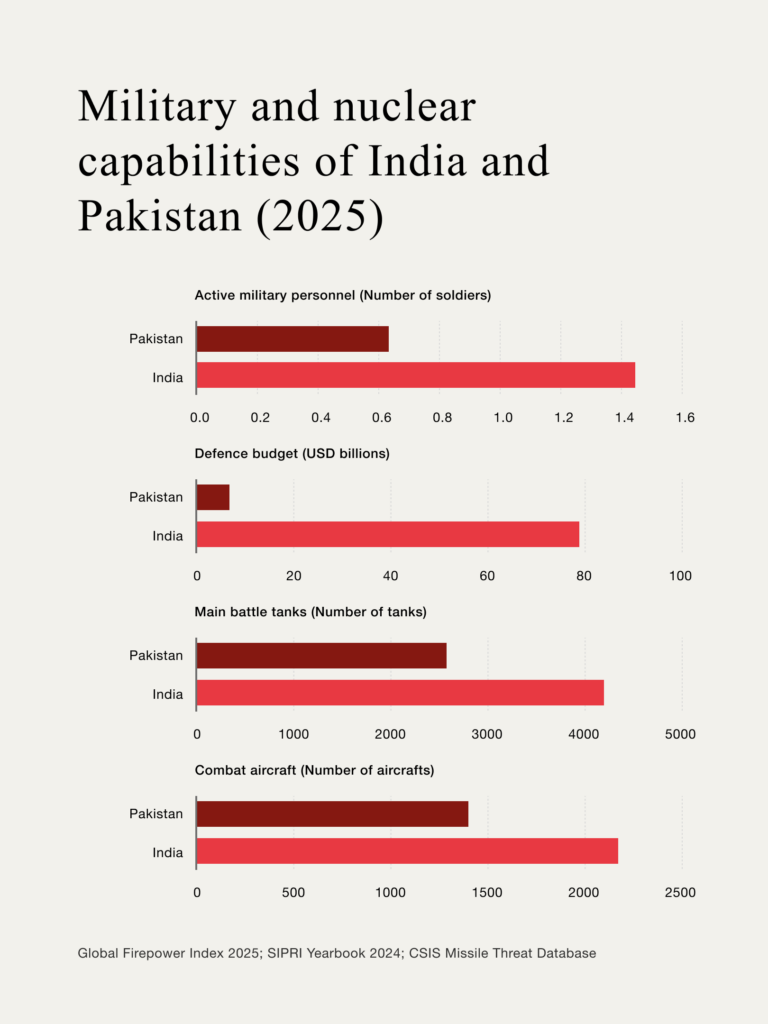Nuclear parity, however, blunts India's military supremacy: India holds an estimated 172 nuclear warheads and Agni-V missiles exceeding 5,200 kilometres. Pakistan maintains roughly 170 warheads, its Shaheen-III missiles reaching 2,750 kilometres.