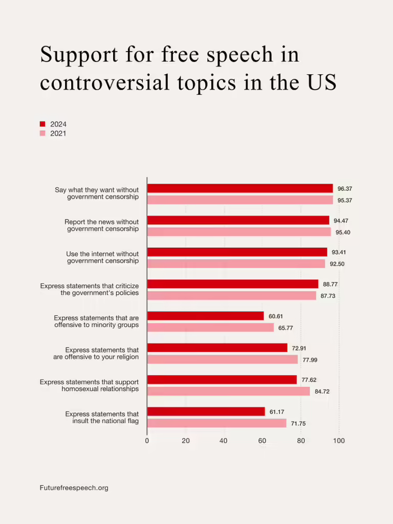 Classical liberalism, with its stress on free speech, thrived under specific conditions: more culturally and ethnically homogenous societies, a top-down public sphere where debate mostly stayed among elite groups, and gatekept platforms like newspapers that controlled what was said—and who got to say it. Today’s world is louder, faster, and more fractured. The slow erosion of shared norms and the fading of ethnic and cultural cohesion have been thrown into the whirlwind of online noise—where everyone can speak, and no one has to listen. People still claim to support free speech—until it touches their nerves. Support drops sharply on religion, gay rights, or race.