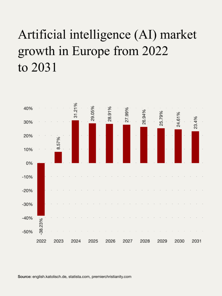 Europe’s consultancy sector is vast—USD 126 billion in 2024 and growing steadily. Brussels, leans heavily on external advice for everything from evaluations to technical assistance. According to the European Court of Auditors: “The Commission makes extensive use of external consultants, committing almost €1 billion…each year between 2017 and 2020.” The European AI market is likewise forecasted to grow by nearly 35% in 2024 and maintain a growth rate exceeding 23% through 2030.