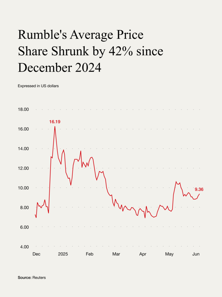 In a similar way to PublicSquare, Rumble saw a sharp rise in its share price in December 2024 to $16.24. It has since settled around $9-10, though volatility persists.