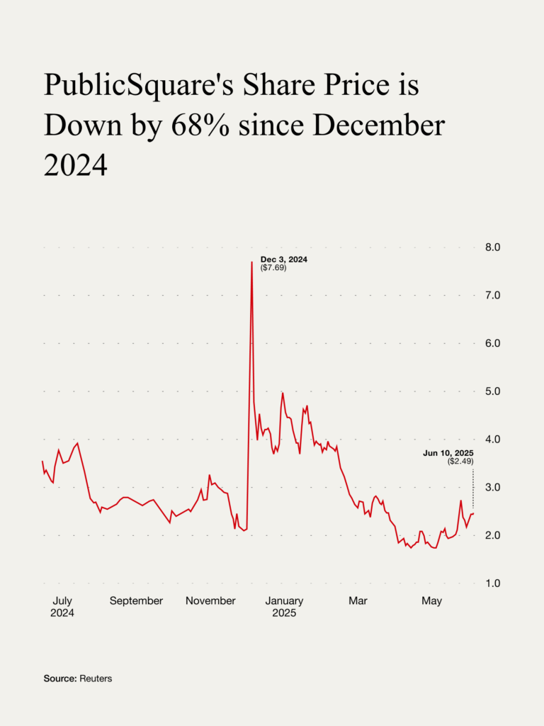 While Mammoth’s financing and results are difficult to find, PublicSquare sounds like a more serious project but doesn’t attract investors in a decisive way—yet. While its share price peaked at $7.63 in December 2024, following President Trump’s election, it is now at one of its lowest share prices ever, $2.53.