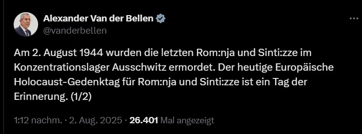 „Am 2. August 1944 wurden die letzten Rom:nja und Sinti:zze im Konzentrationslager Ausschwitz ermordet. Der heutige Europäische Holocaust-Gedenktag für Rom:nja und Sinti:zze ist ein Tag der Erinnerung“, postete der Mann in der Hofburg am Samstagnachmittag. Wie jeder halbwegs gebildete Europäer weiß, wird der Ort des Konzentrationslagers nur mit einem „s“ geschrieben, nämlich als Auschwitz.