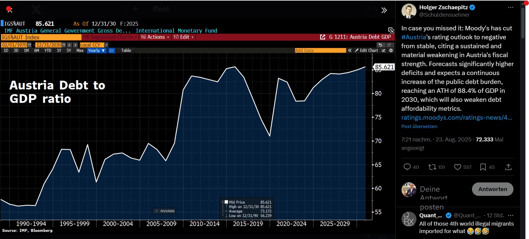 Dazu ist auch die Außensicht auf Österreichs Probleme interessant: Bei der Bewertung im Februar ging Moody's von einem Haushaltsdefizit von drei Prozent und einem allmählichen Anstieg der Staatsverschuldung auf 83 Prozent des BIP im Jahr 2030 aus - blog.at hat berichtet. Aktuell rechnet die Ratingagentur mit einem Anstieg der Staatsverschuldung bis 2030 auf 88,4 Prozent des BIP - und damit auf einen historischen Höchststand. Die von Moody's prognostizierte Schuldenquote wird 2030 nur in den Vereinigten Staaten von Amerika und Kanada höher sein.