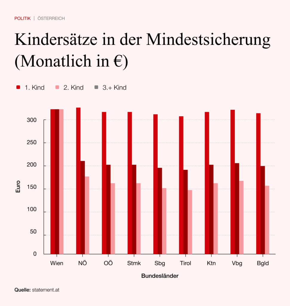 Das Wiener Sozialhilfemodell unterscheidet sich in wesentlichen Punkten von jenem anderer Länder. Der wichtigste Unterschied betrifft die Kindersätze: Wien zahlt für jedes Kind denselben Betrag von derzeit 326 Euro, während andere Bundesländer eine Staffelung vorsehen, bei der für das dritte und jedes weitere Kind weniger ausbezahlt wird. In der Praxis bedeutet das, dass gerade große Familien in Wien deutlich höhere Leistungen erhalten können.