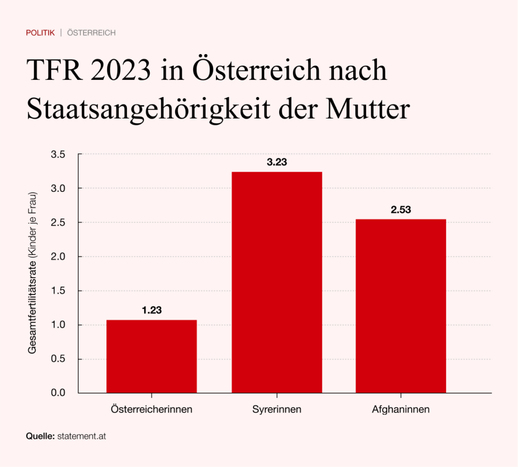 Seit der Jahrtausendwende hat sich die Zuwanderung weiter beschleunigt. 2020 lebten rund 1,49 Millionen Ausländer in Österreich, fünf Jahre später sind es bereits 1,86 Millionen. Innerhalb weniger Jahre kamen also Hunderttausende hinzu – eine Entwicklung, die in der öffentlichen Debatte oft beschönigt oder kleingeredet wird. Einen nicht unwesentlichen Teil zum demografischen Wandel trägt die Geburtenrate bei. Während die Fertilitätsrate (TFR) bei Österreicherinnen bei 1,23 Kinder liegt, bringen Frauen aus der arabischen Welt dreimal mehr Kinder zu Welt - wie statement.at bereits berichtete.