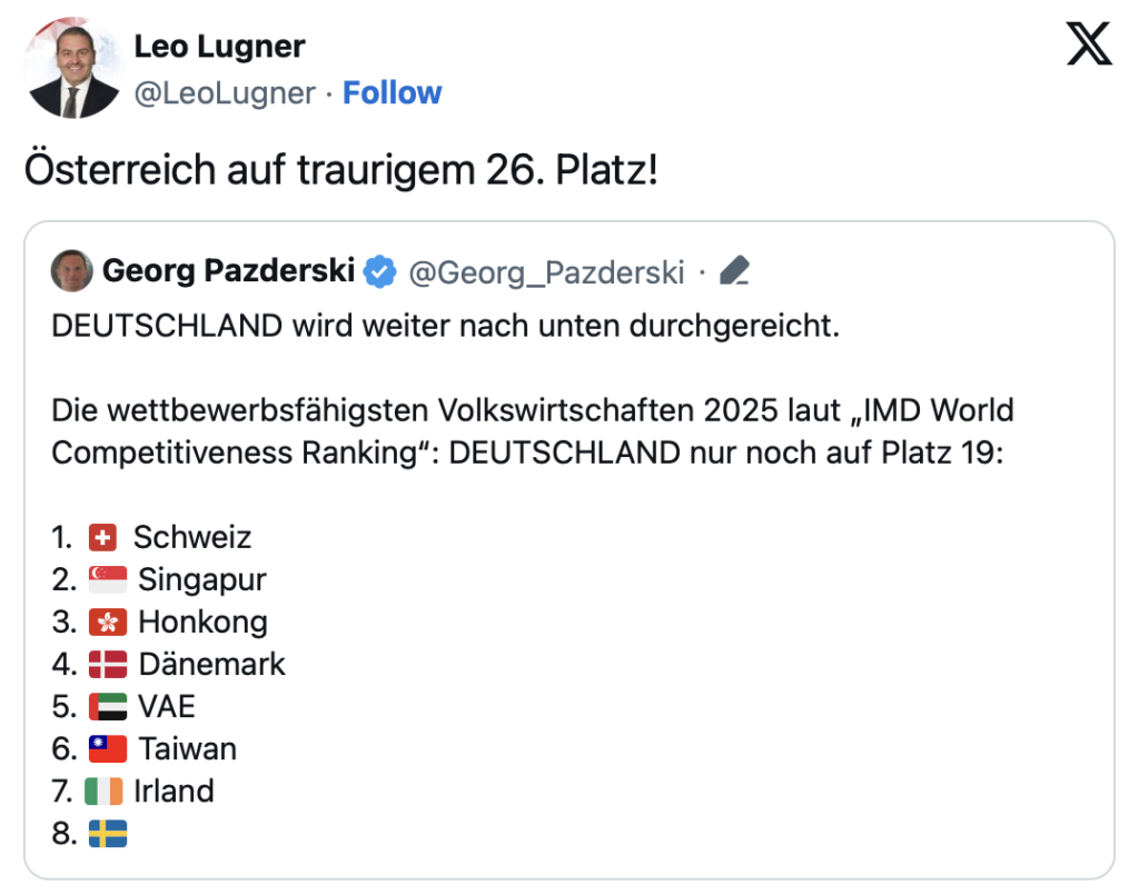 Die Studie des Instituts IMD aus dem schweizerischen Lausanne gilt für Entscheidungsträger der Wirtschaft traditionell als wichtiger Gradmesser. Häufig dient sie als Grundlage, wenn Unternehmen Standort- und Investitionsentscheidungen treffen. Untersucht wurden für 2025 insgesamt 69 Staaten und Volkswirtschaften - mit besorgniserregendem Ergebnis für Österreich.