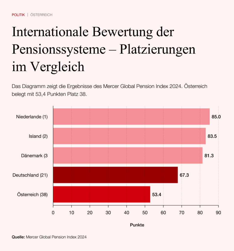 Während Länder wie die Niederlande, Island und Dänemark mit mehr als 80 Punkten an der Spitze stehen, liegt Österreich mit 53,4 Punkten auf Platz 38 – also im hinteren Drittel des Rankings. Damit zählt das heimische Pensionssystem zu den schwächsten Europas. Schon 2023 hatte Mercer gewarnt, dass Österreich eines der „am wenigsten nachhaltigen Systeme“ unter den OECD-Staaten betreibe.