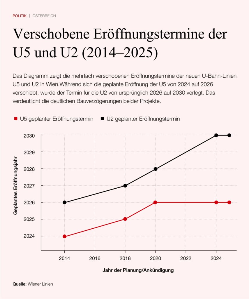 Die U5 wurde 2014 angekündigt und sollte ursprünglich 2024 in Betrieb gehen. Bereits ab 2018 zeigten sich Ausschreibungsprobleme, Preissteigerungen und geologische Herausforderungen. Die Eröffnung wurde erst auf 2025, dann auf 2026 verschoben. Die U2 sollte 2026 verlängert werden, später 2027, dann 2028 und zuletzt 2030. Auch der Kostenrahmen entwickelte sich dynamisch: 2020 wurden 2,1 Milliarden Euro für die erste Baustufe genannt, mittlerweile liegt dieser bei rund 2,4 Milliarden. Der Stadtrechnungshof schätzte 2021 das gesamte Linienkreuz schon auf über sechs Milliarden Euro.