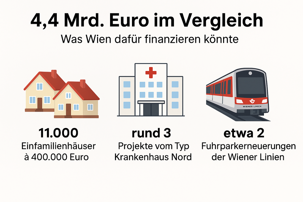 Bei einem Durchschnittspreis von 400.000 Euro pro Haus könnte man mit dem bisherigen U2/U5-Budget rund 11.000 Einfamilienhäuser finanzieren. Das ist mehr als die gesamte Bebauungsdichte mancher niederösterreichischer Städte. Mit anderen Worten: Man hätte Stadtteile Wiens vollständig neu bebauen können – inklusive Gärten, Garagen und Infrastruktur.