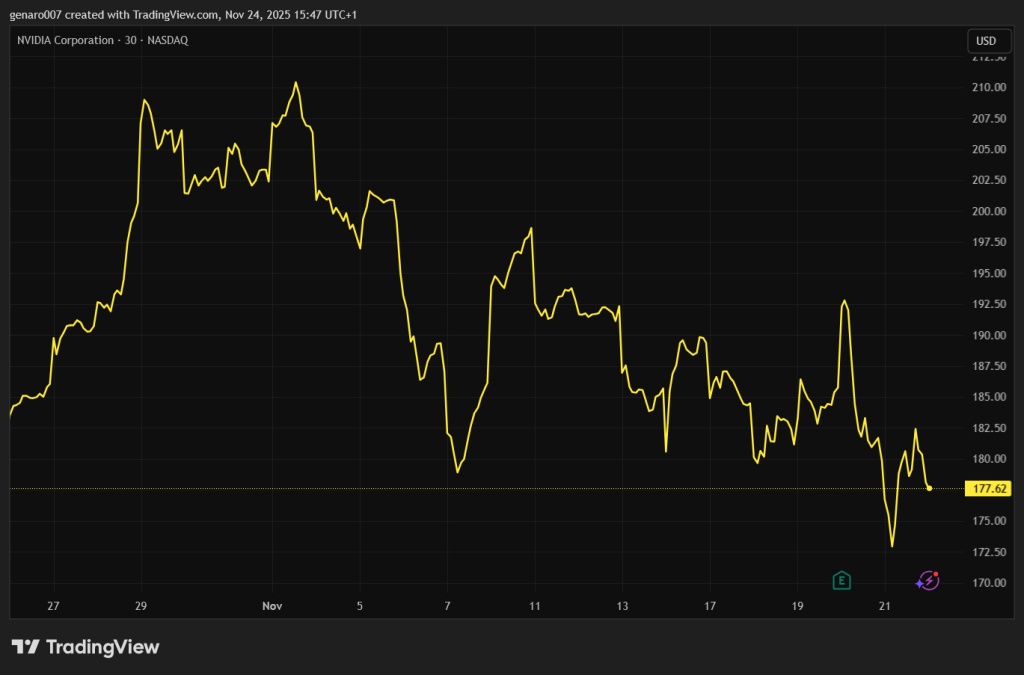 Nach der Veröffentlichung dieser ausgezeichneten Ergebnisse stiegen die Aktien nachbörslich an. Bei der Markteröffnung ließ das Wachstum allmählich nach. Am Donnerstag, den 13. November, lag der Aktienkurs von Nvidia am Morgen noch im grünen Bereich. Der Wendepunkt kam um 10:37 Uhr New Yorker Zeit, als ein riesiges Aktienpaket zum Verkauf auf den Markt kam. Wieder einmal begannen sich die Märkte zu fragen, wie die ganze Sache mit der künstlichen Intelligenz eigentlich laufen würde.