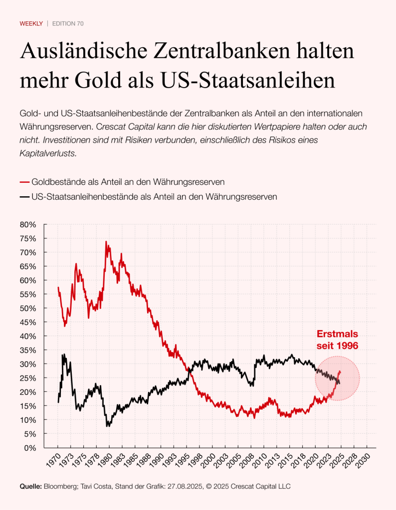 Die Entwicklung ist das Ergebnis mehrerer Faktoren. Der wichtigste besteht darin, dass der US-Dollar zunehmend als politisches Instrument eingesetzt wird. Das Einfrieren russischer Dollar-Vermögenswerte gilt vielen Regierungen als Warnsignal: Sich auf Dollarreserven zu verlassen, könnte sich eines Tages als schwerer Fehler erweisen.